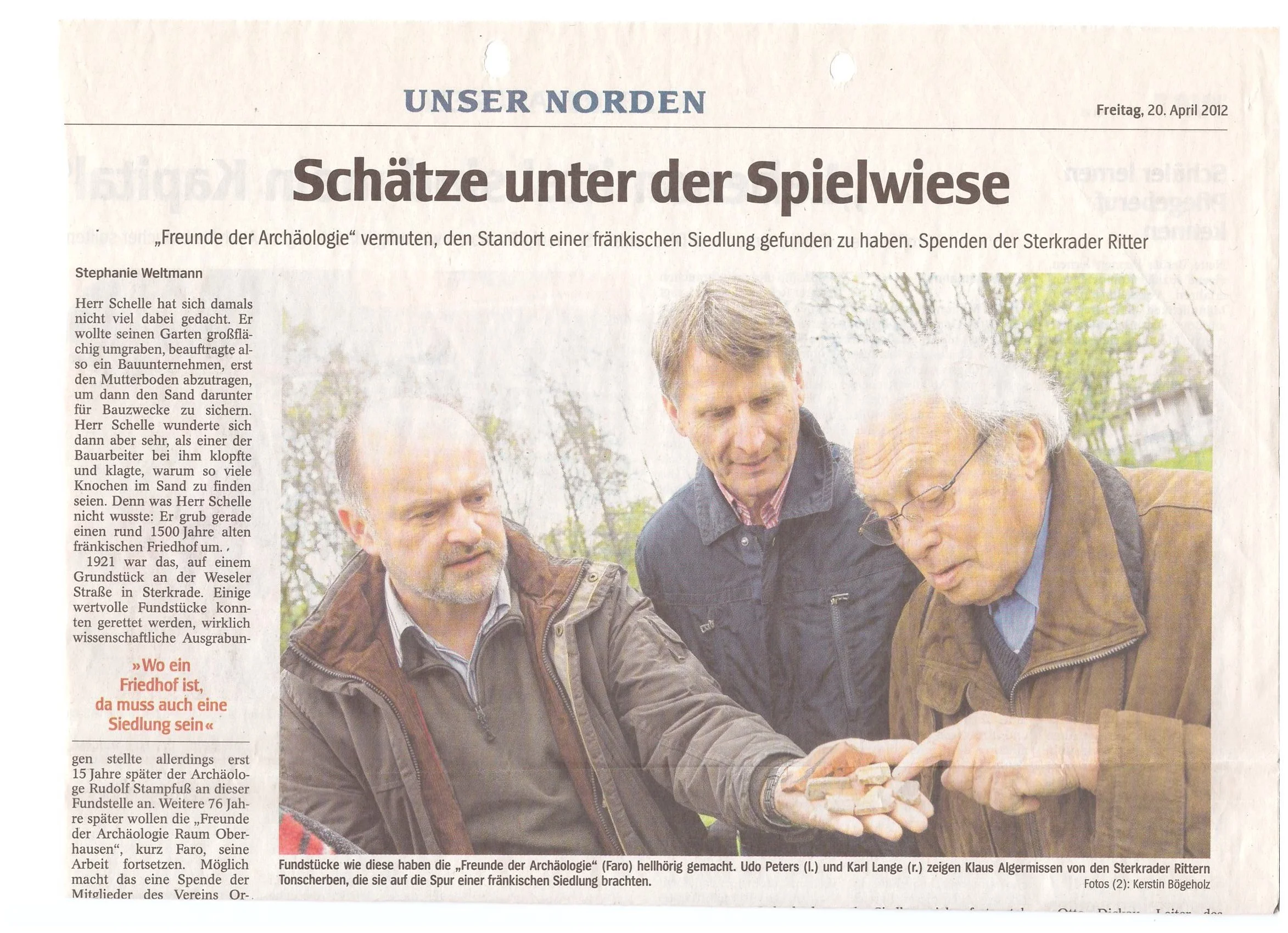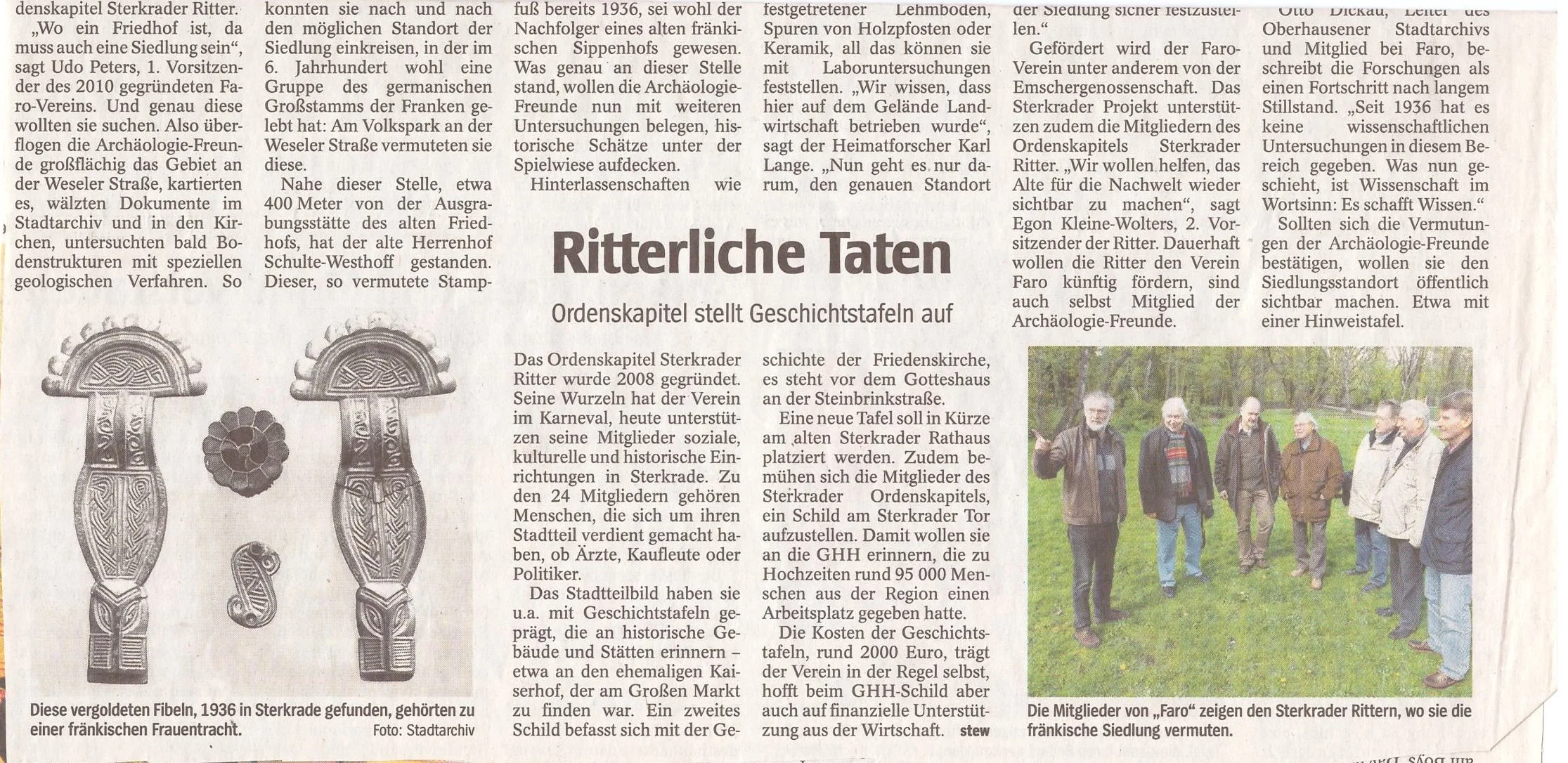 Ein Zeitungsartikel von 2012 berichtet über archäologische Funde in Sterkrade, bei denen auch die Sterkrader Ritter beteiligt waren. Unter einer Spielwiese wurden Hinweise auf eine fränkische Siedlung entdeckt, die spannende Einblicke in die lokale Geschichte geben.